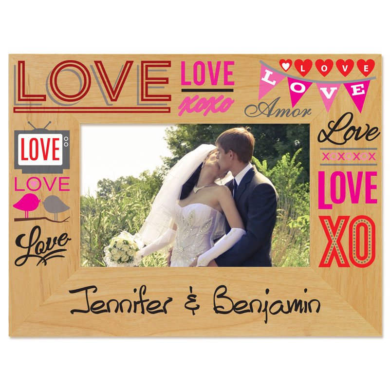 The Affection Print Picture Frame features our love-themed artwork and your one line of bottom personalization precision-printed on our beautiful Alderwood material. Displays a 4" x 6" photograph. Choose from 10 popular lettering styles and 12 ink colors to create a great display for your home decor. The end result...a gorgeous multi-color frame and raised personalization.
