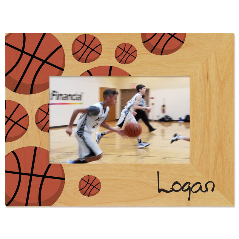 The Basketball Print Picture Frame features our basketball print artwork and your name precision-printed on our beautiful Alderwood material. Displays a 4" x 6" photograph. The end result...a gorgeous multi-color frame and raised personalization.