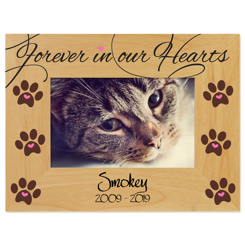 The Forever in our Hearts Memorial Print Picture Frame features our heart paw print artwork precision-printed on our beautiful Alderwood material. Displays a 4" x 6" photograph. The end result...a gorgeous multi-color frame and raised personalization.