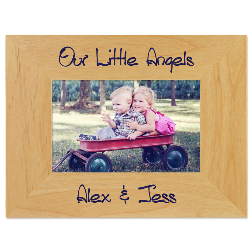 The Highland Picture Frame offers both top and bottom lines of text in your choice of 10 lettering styles. Your personalization is printed with the utmost precision into the beautiful Alderwood material.