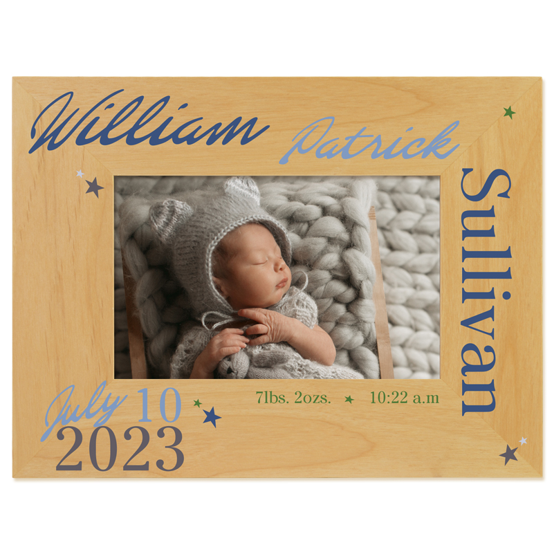 The Little Boy Blue Print Picture Frame features any first name, middle name, last name, date, weight and time precision-printed on our beautiful Alderwood material. Displays a 4" x 6" photograph. The end result...a gorgeous multi-color frame and raised personalization.